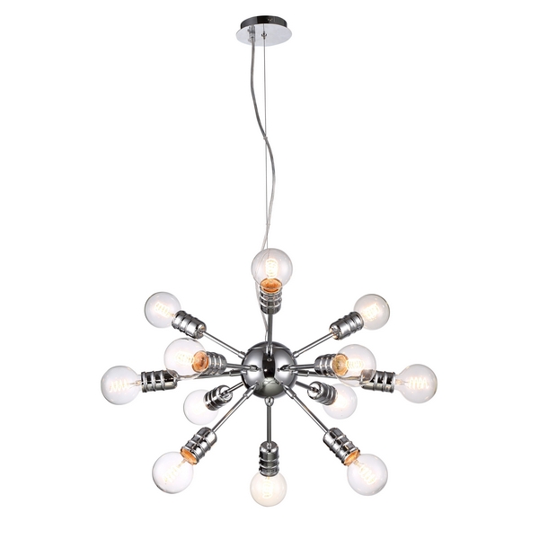 Подвесная люстра Fuoco A9265SP-12CC — модель от итальянской фабрики Artelamp. Основа люстры выполнена из металла цвета хрома. Люстра будет хорошо смотреться в гостиной, холле, зале, предпочтительный стиль дизайна — лофт индустриальный. Цоколь — E27 с максимальной мощностью лампочки 60 Вт. Общая площадь освещения составляет 36 кв. м. Высота модели — 33 см, диаметр — 52 см. Люстра имеет 12 лампочек, регулируется по высоте и устанавливается на монтажную пластину. Есть возможность подключения диммера. Степень защиты от влаги и пыли — IP20. Закажите подвесную люстру A9265SP-12CC по лучшей цене с быстрой доставкой на Wikisvet.ru!